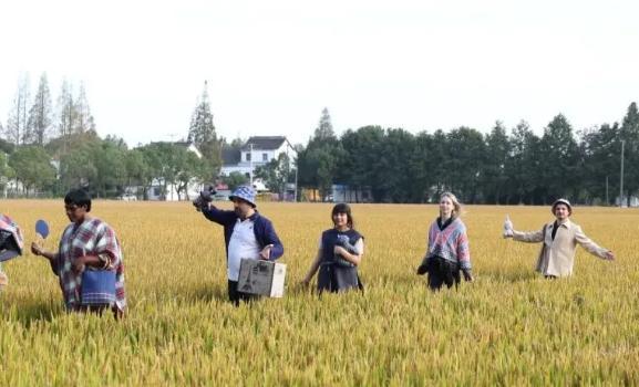 他们兴奋地走在田埂上,留下一张张“时尚大片”,模特范十足。而他们身上的这些充满设计感的服装,正是用松江当地的非遗土布裁剪缝制而成的。