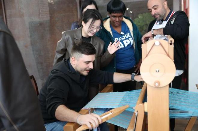 阿伊巴手持梭子在织布机上体验手工织布。她说:“我原以为布上的图案是印花或是刺绣,没想到是直接编织出来的。让我特别震撼的是,这门技艺传承了700年,到现在还充满生命力。你们不仅保留了技艺,还不断改进它,这体现了对文化的自信和尊重,让人敬佩!”