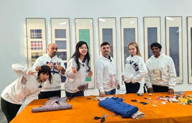 在DIY环节,5位外国朋友纷纷拿起裁剪工具,用松江布创作属于自己的帽衫。