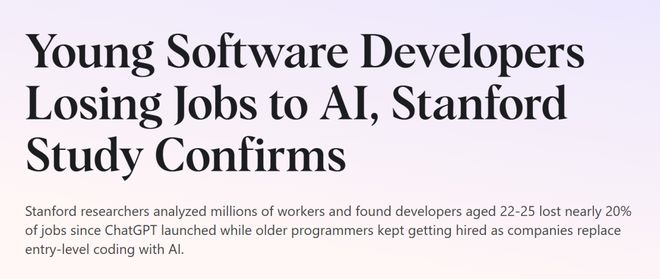 而斯坦福大学的研究发现,自从2022年底AI工具的普及,22至25岁的程序员就业率下降了近20%。